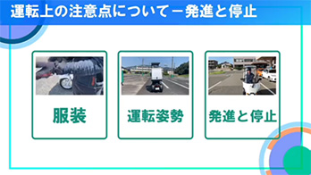基本的な操作・注意点をはじめ、事故を起こさない具体的な注意ポイントまで学習できます。